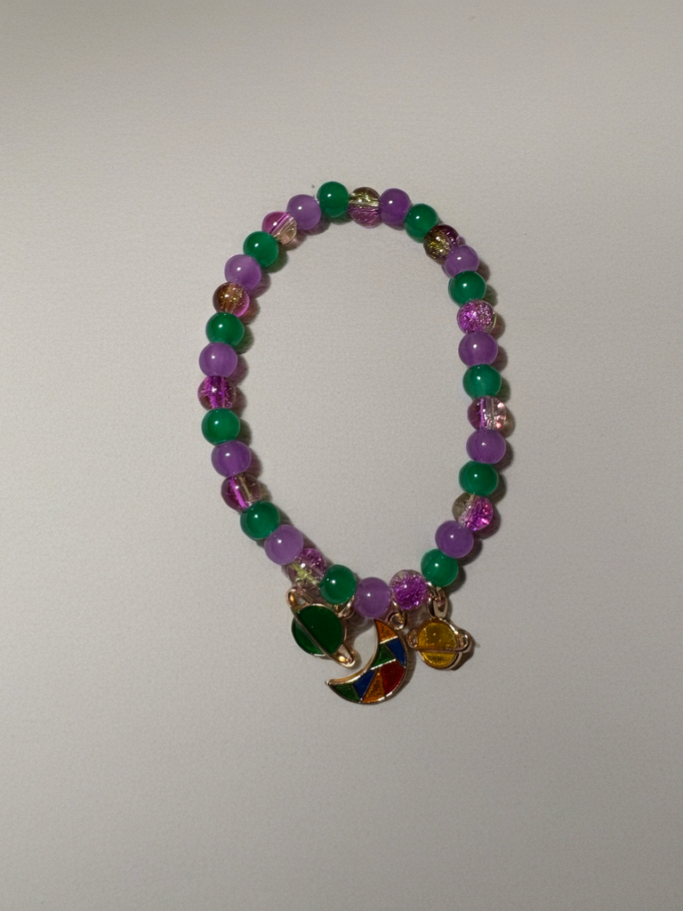 Purple, crackled purple, green, and green and purple crackled glass beads strung together with planet and a moon charm to form a celestial like bracelet.
